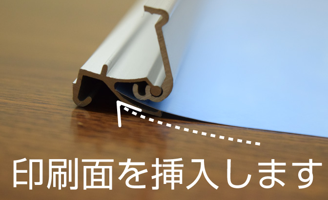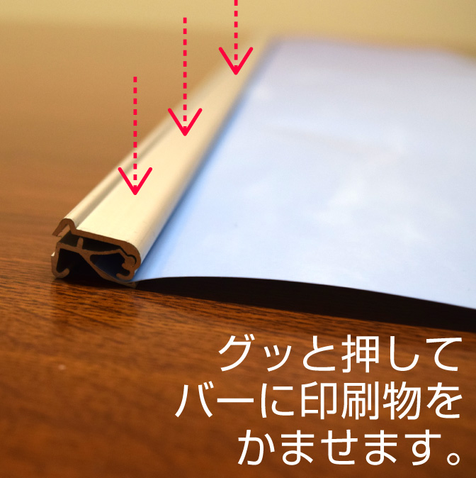上部バーを持って印刷メディアを引き上げて、上部バーのウラ面についている矢印のシールの位置に支柱の先端のフックを取り付けます。