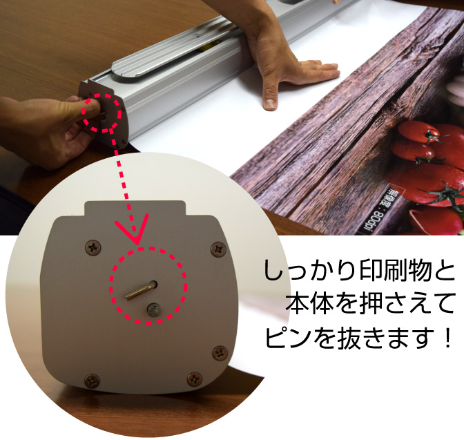 STEP.1とSTEP.2、上下のバーと印刷メディアの取り付けはどちらを先にやっていただいても構いません。※ピンを抜くのは最後です。