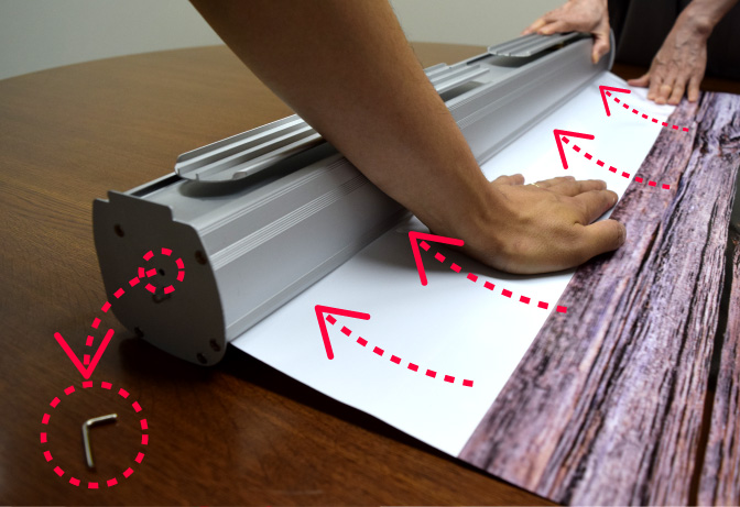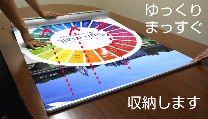 ロックピンが抜けるとバナー本体が印刷メディアを巻き取る力が発生します。印刷メディアから手を離さずにゆっくり、まっすぐスタンド本体に印刷メディアを収納していきます。