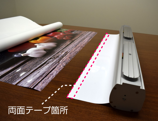 両面テープの幅分、印刷メディアを貼り合わせます。その際に左右のずれなくまっすぐ貼るようにしてください。