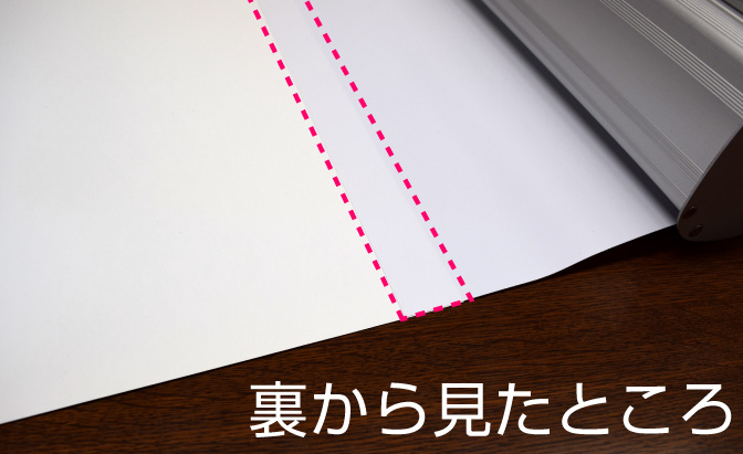 バナースタンド本体(下部)には予め印刷メディアを取り付けるための白いシート「メディア取付シート」が本体からベロのように出ております。そのメディア取り付けシートの先端が両面テープになっています。