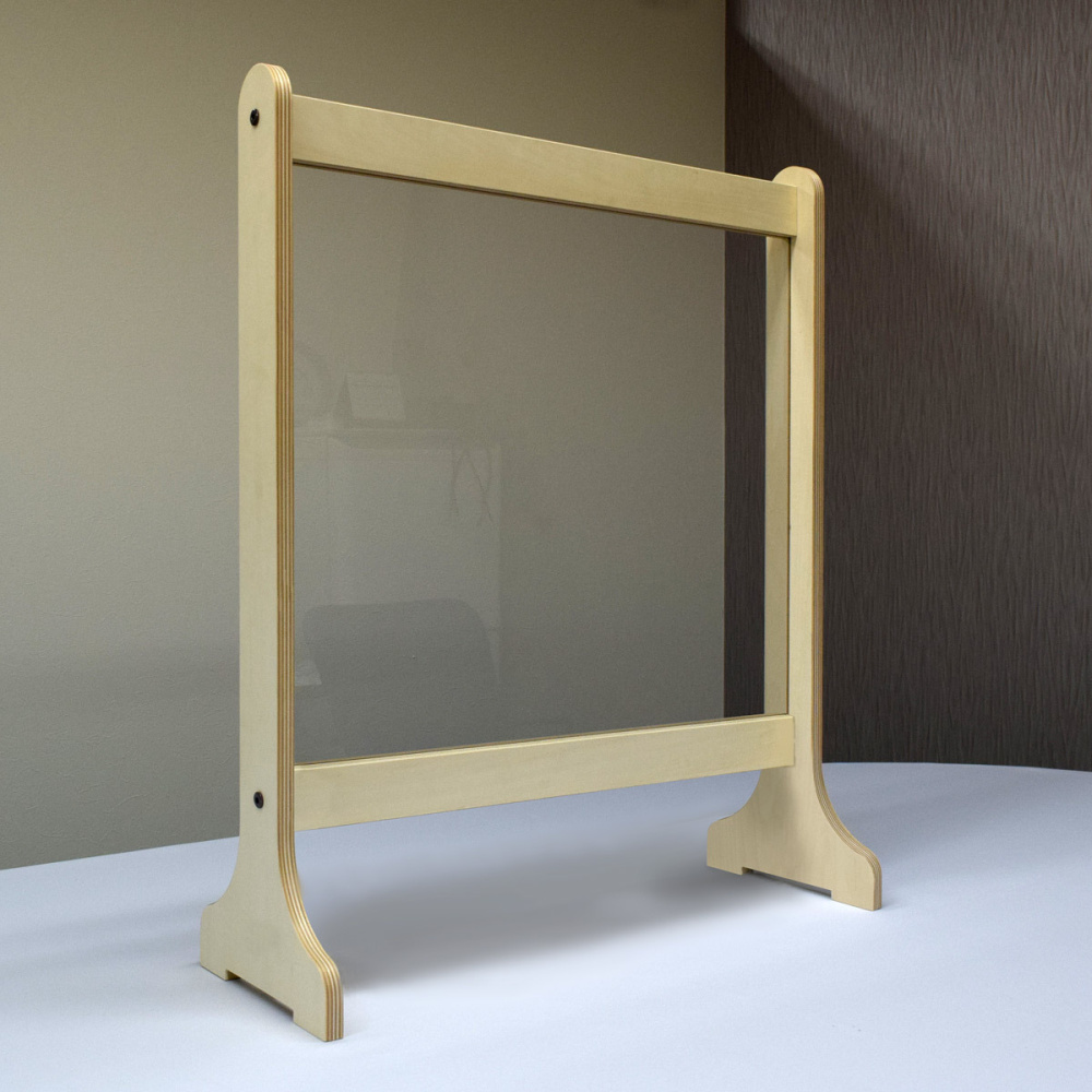 - 透明板の4辺をしっかう覆う木製パネルでウイルス菌が対面側に拡散しにくい構造です。