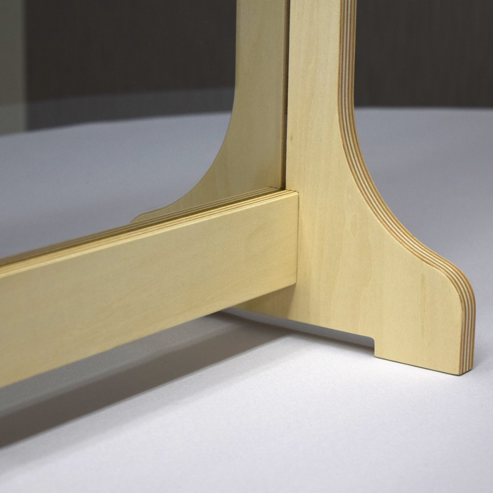 - 透明板の4辺をしっかう覆う木製パネルでウイルス菌が対面側に拡散しにくい構造です。