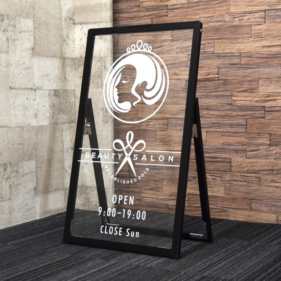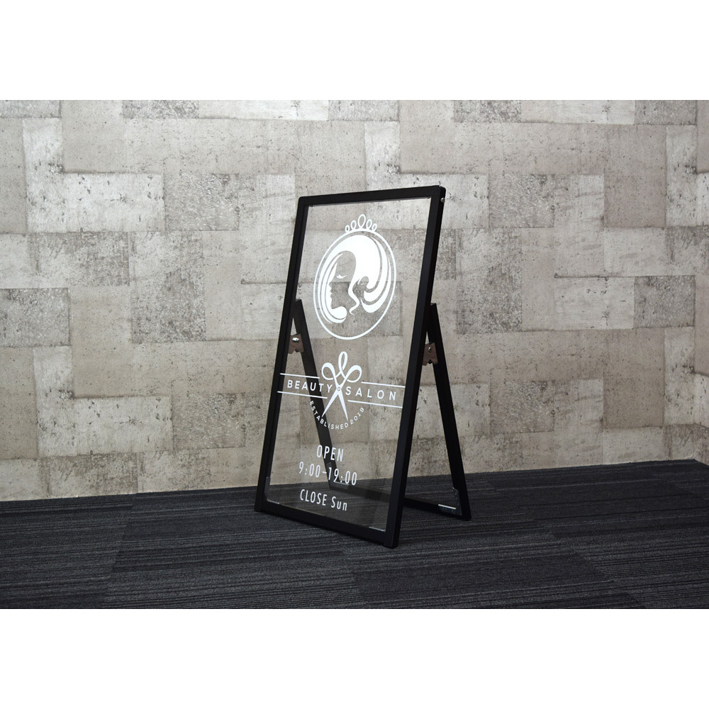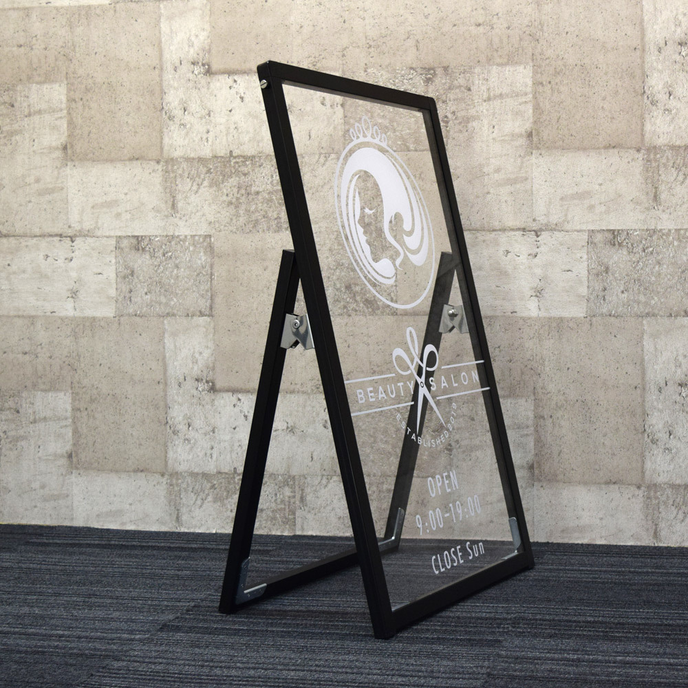 表示面が透明のオシャレなサインスタンド。店頭にスタイリッシュでオシャレな印象を与えます。