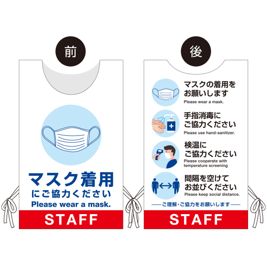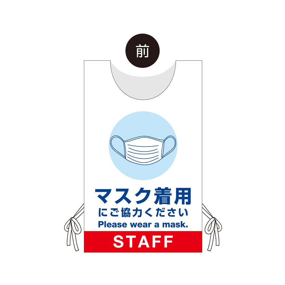 - 看板や表示プレートと違い、実際に「人」が着るのでアイキャッチ効果抜群!感染症対策の「見える化」にも大きく貢献します。