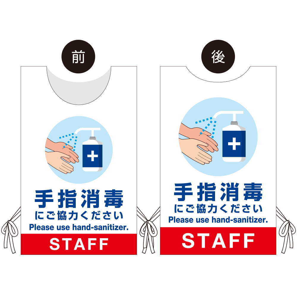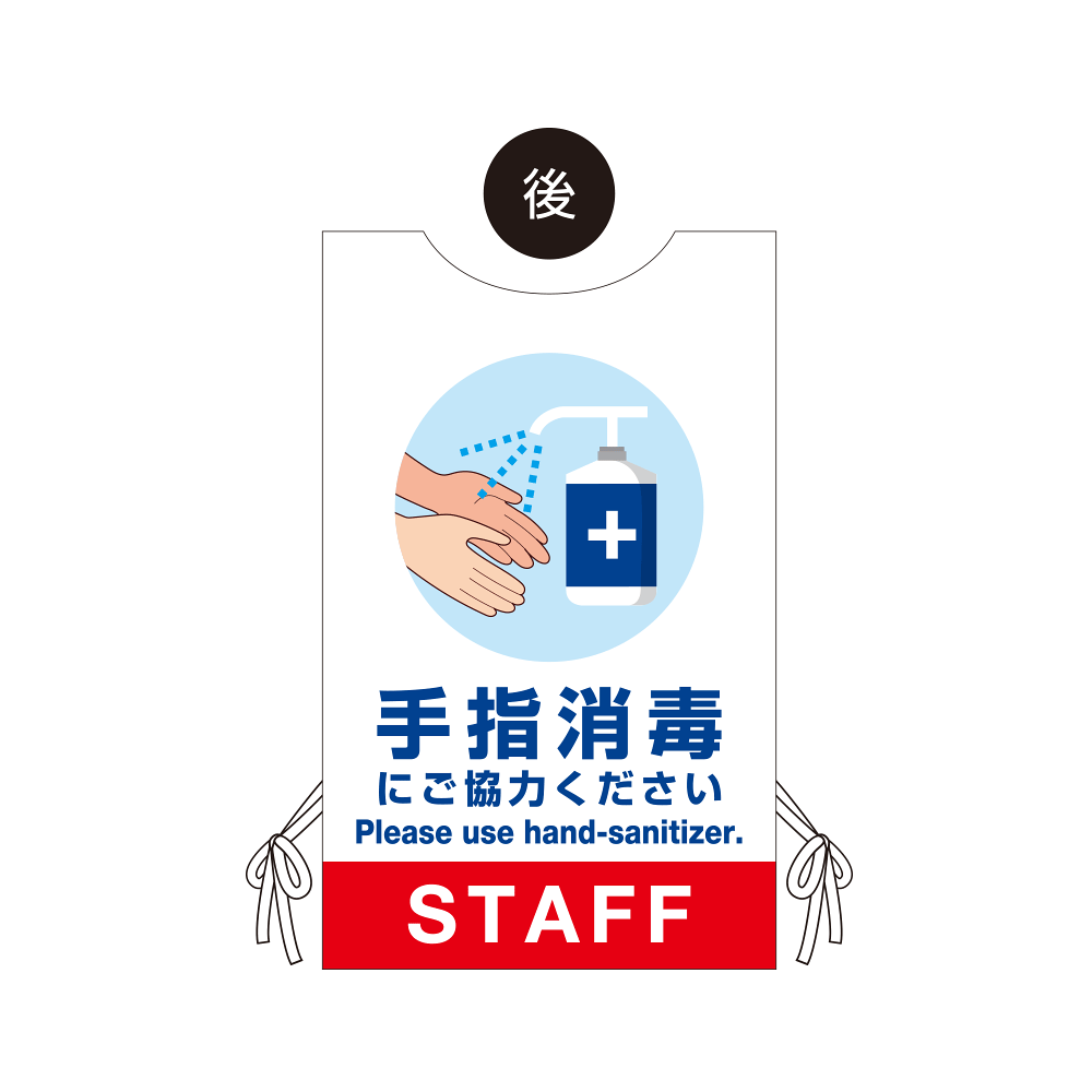 - 看板や表示プレートと違い、実際に「人」が着るのでアイキャッチ効果抜群!感染症対策の「見える化」にも大きく貢献します。