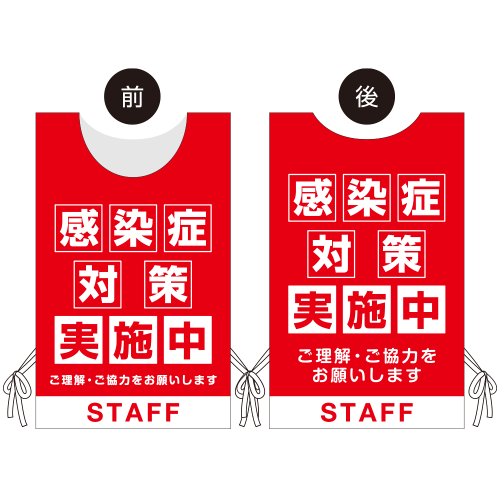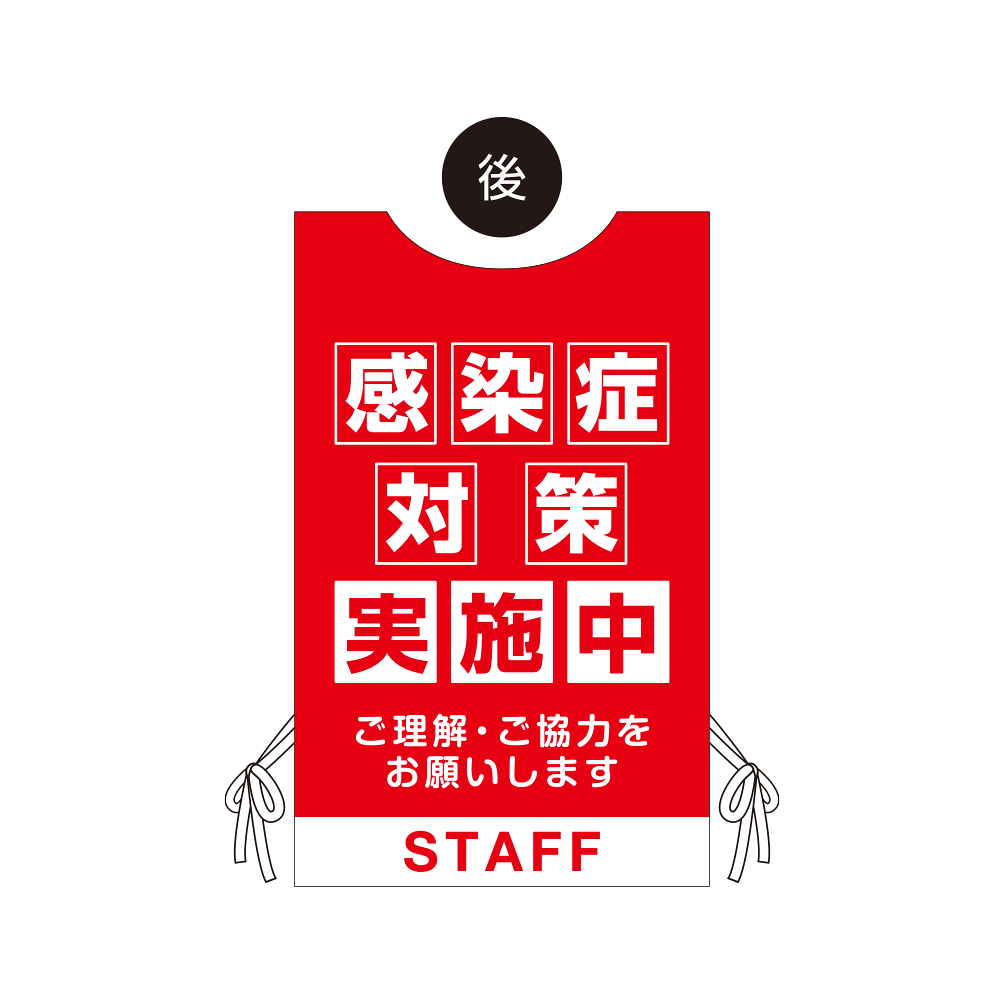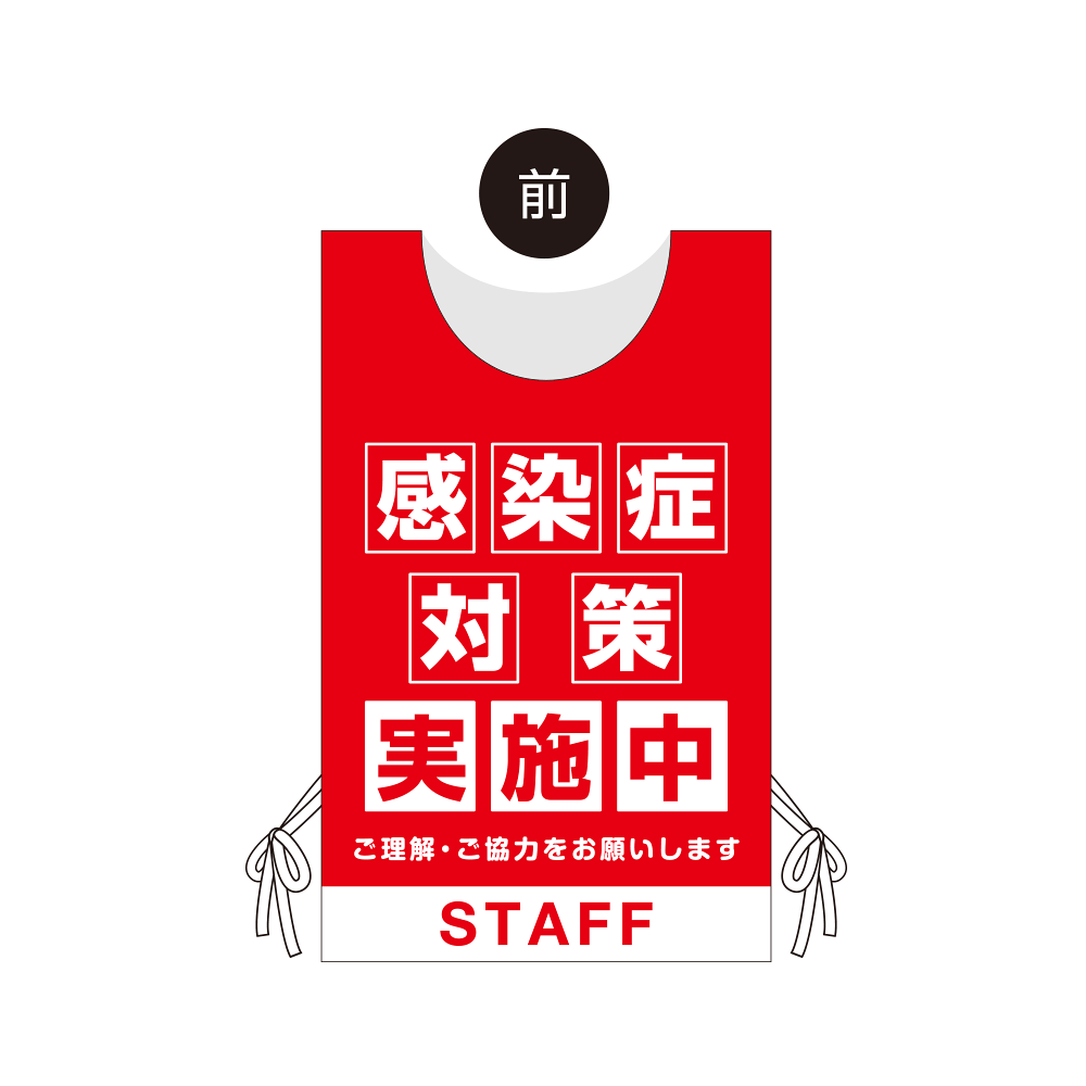 - 看板や表示プレートと違い、実際に「人」が着るのでアイキャッチ効果抜群!感染症対策の「見える化」にも大きく貢献します。