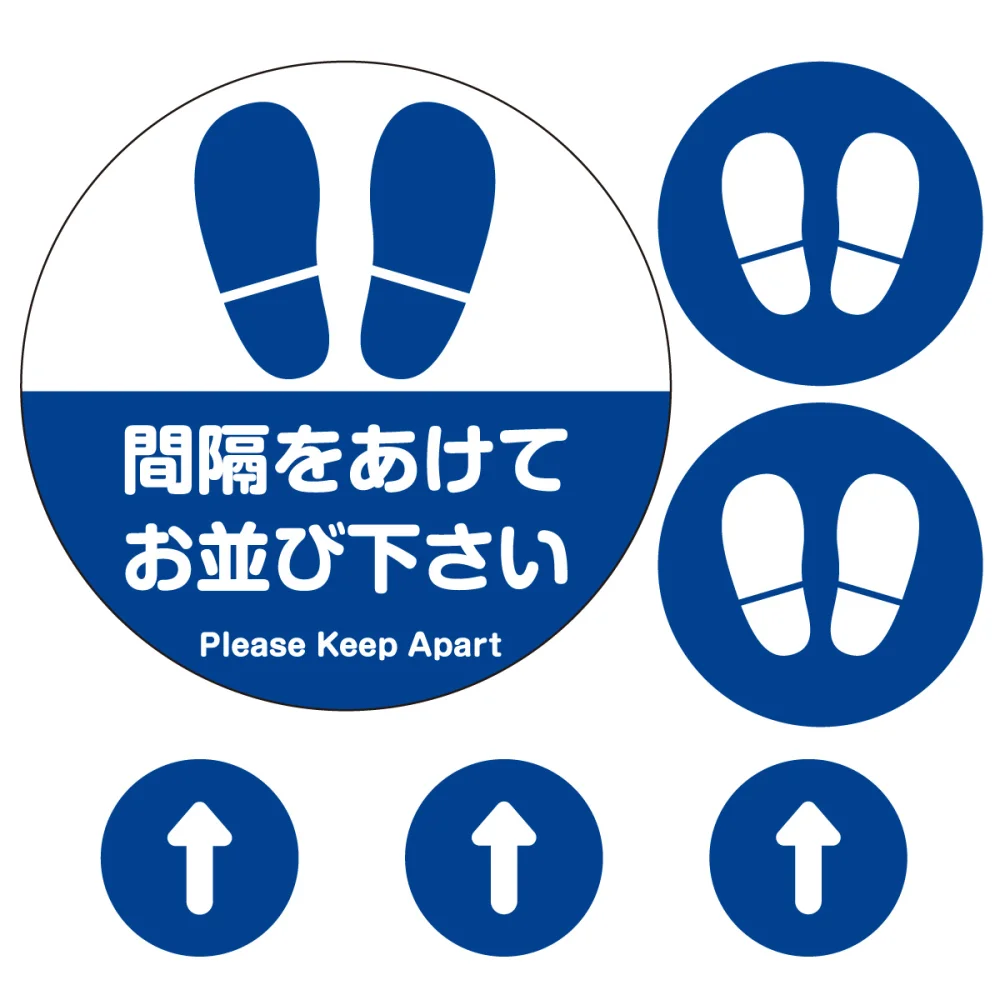 - レジ前に最適な【大サイズ(Φ230mm)】×1枚と、その手前の立ち位置の目印に半分サイズの【中サイズ(Φ115mm)】×2枚、更にその前の導線に最適な【小サイズ(Φ70mm)】×3枚がセットになったソーシャルディスタンス確保用のレジ・カウンター用フロアステッカーです。
