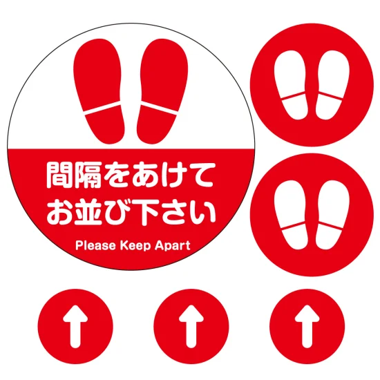 - レジ前に最適な【大サイズ(Φ230mm)】×1枚と、その手前の立ち位置の目印に半分サイズの【中サイズ(Φ115mm)】×2枚、更にその前の導線に最適な【小サイズ(Φ70mm)】×3枚がセットになったソーシャルディスタンス確保用のレジ・カウンター用フロアステッカーです。