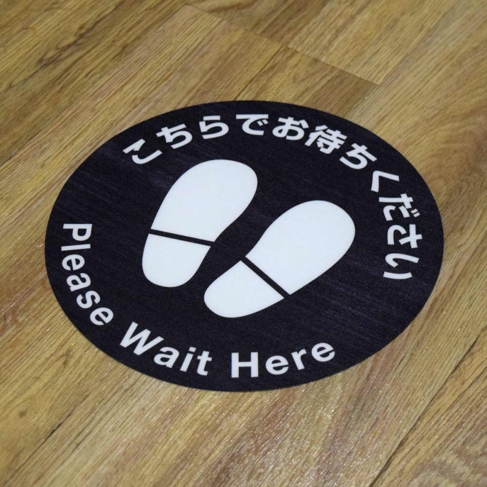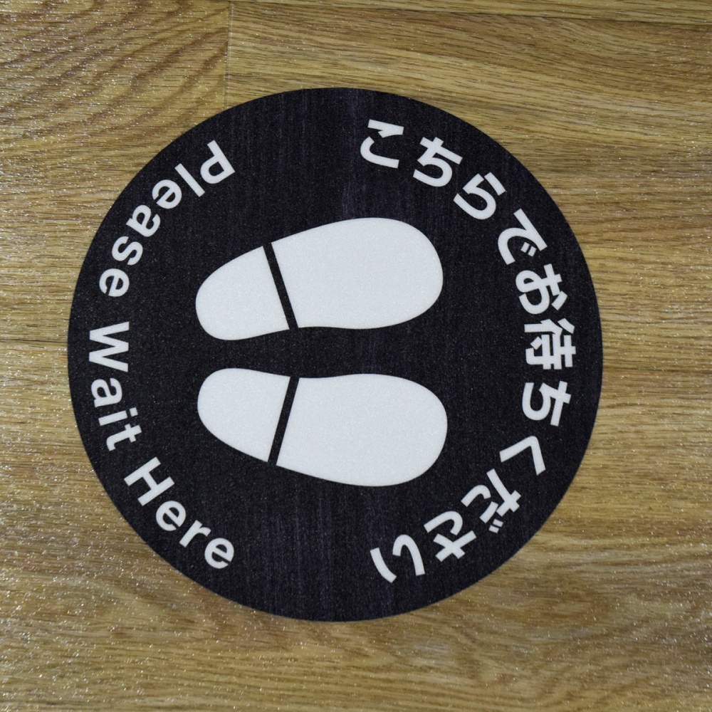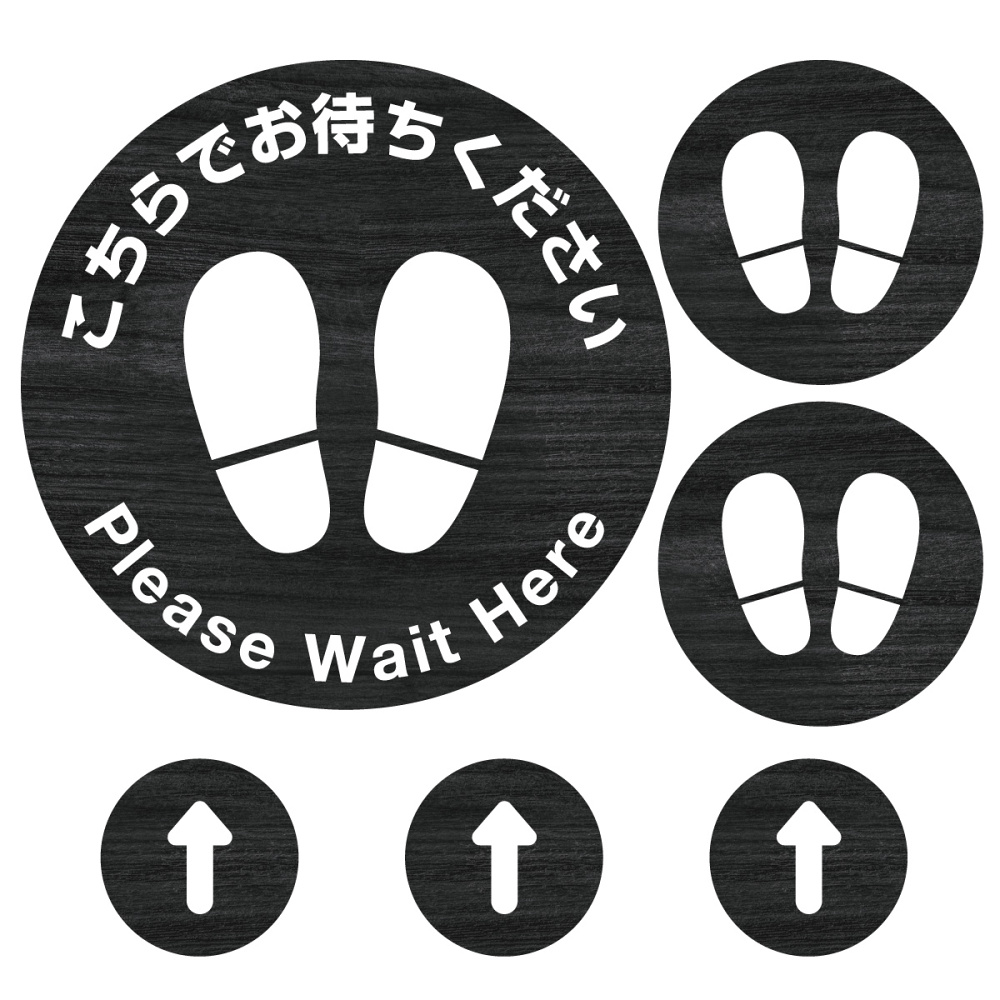 - レジ前に最適な【大サイズ(Φ230mm)】×1枚と、その手前の立ち位置の目印に半分サイズの【中サイズ(Φ115mm)】×2枚、更にその前の導線に最適な【小サイズ(Φ70mm)】×3枚がセットになったソーシャルディスタンス確保用のレジ・カウンター用フロアステッカーです。