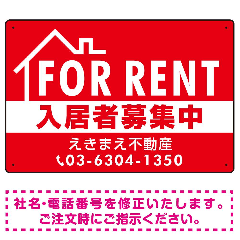商品説明:FOR RENT 入居者募集中 左上イラスト 赤地/白タイトル オリジナル プレート看板 W450×H300 エコユニボード (SP-SMD412B-45x30U)