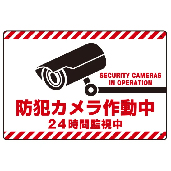「防犯カメラ作動中 24時間監視中 赤白トラテープ柄 オリジナル プレート看板 W450×H300 アルミ複合板」の導入をご検討中ですか? 大量注文・複数台のご検討に応じたお見積りのご相談、最短納期や送料、仕様・サイズの確認など、 防犯カメラ用プレート看板選びをまとめてサポートいたします。
