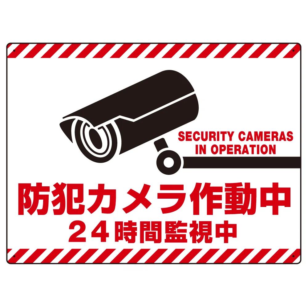 - 防犯カメラ作動中 24時間監視中 赤白トラテープ柄 オリジナル プレート看板 W600×H450 エコユニボード