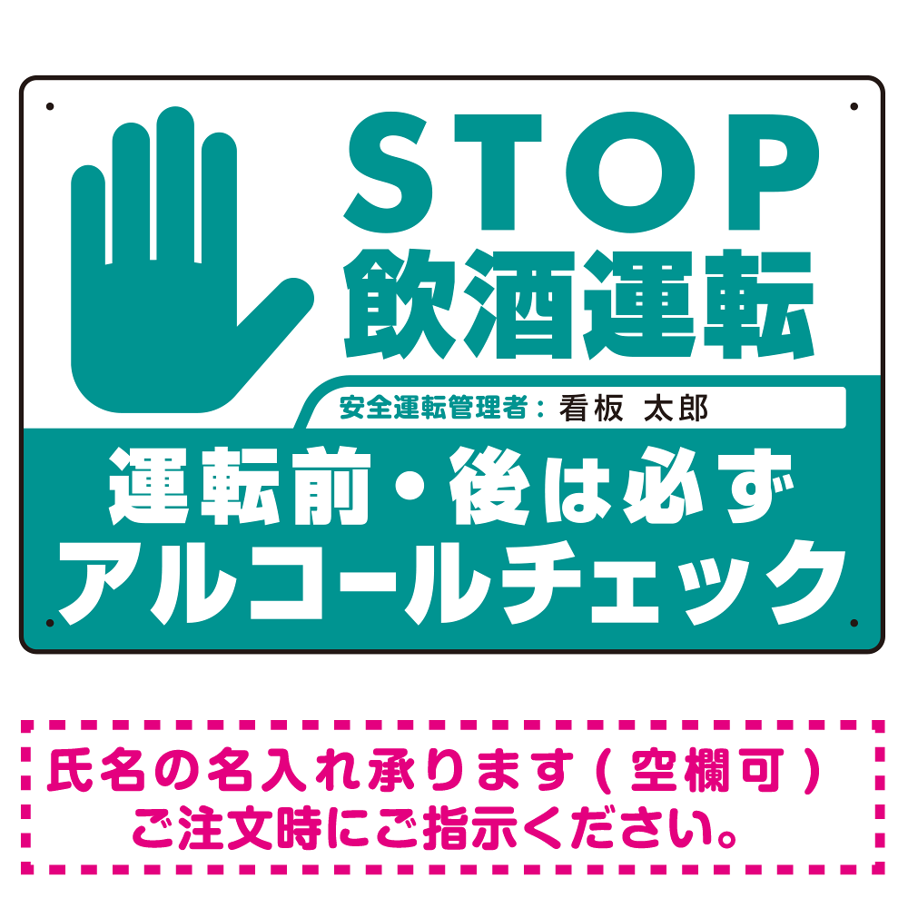 商品説明:安全運転管理者枠付きSTOP飲酒運転 アルコールチェック 手形イラスト エメラルドグリーン オリジナル プレート看板 W450×H300 エコユニボード