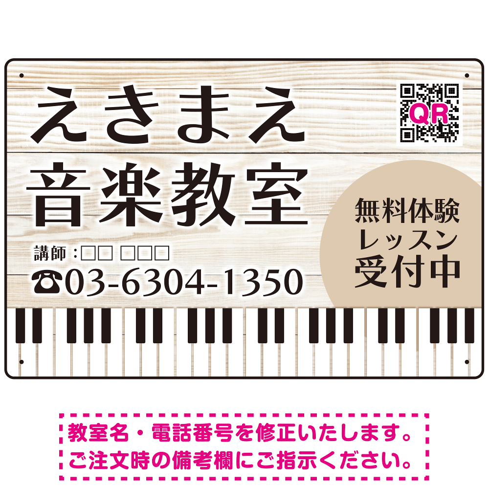 - 白木柄に黒文字がよく映える読みやすいデザインです。無料体験レッスン受付もしっかりPR!