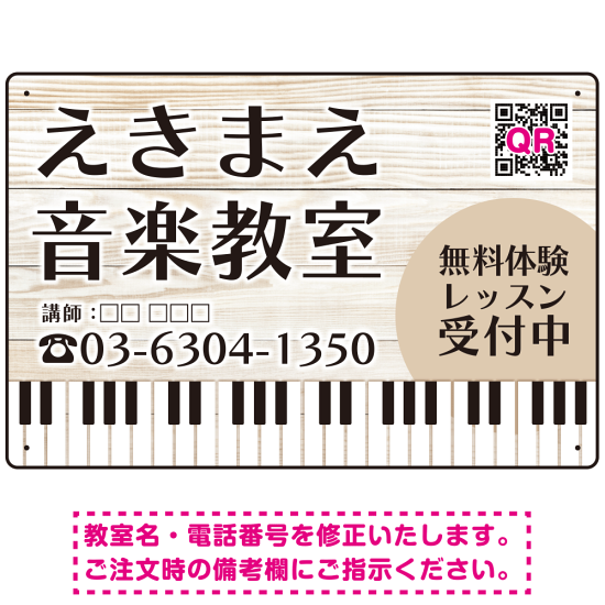 白木の木目調背景にピアノの鍵盤をデザインした爽やかな音楽教室デザインプレート看板。