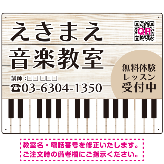 - 白木柄に黒文字がよく映える読みやすいデザインです。無料体験レッスン受付もしっかりPR!