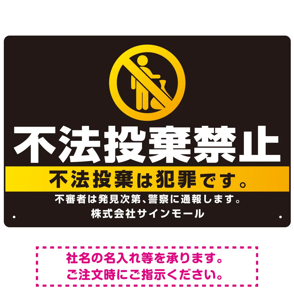 「ブラック&ゴールド調 不法投棄禁止デザイン プレート看板 W450×H300 エコユニボード (SP-SMD472-45x30U)」の導入をご検討中ですか? 大量注文・複数台のご検討に応じたお見積りのご相談、最短納期や送料、仕様・サイズの確認など、 不法投棄禁止看板選びをまとめてサポートいたします。