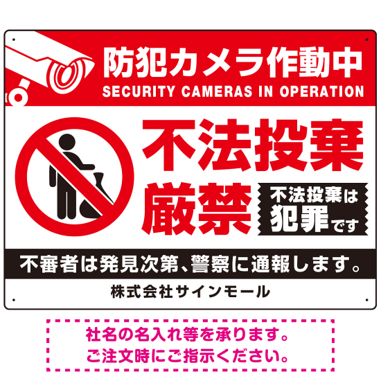 - 防犯カメラ作動中をしっかりアピールした上で、不法投棄を防止するプレート看板デザイン。