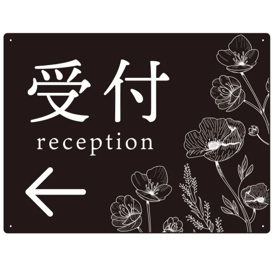- 出入り口誘導 フラワーシルエット/モノトーンデザイン オリジナル プレート看板 受付/左矢印 W600×H450 アルミ複合板 (SP-SMD506L-60x45A)