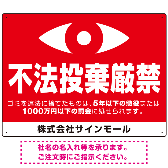 監視の目イラスト付き不法投棄厳禁 警告デザイン オリジナル プレート看板 ヨコ型 600×450 エコユニボード