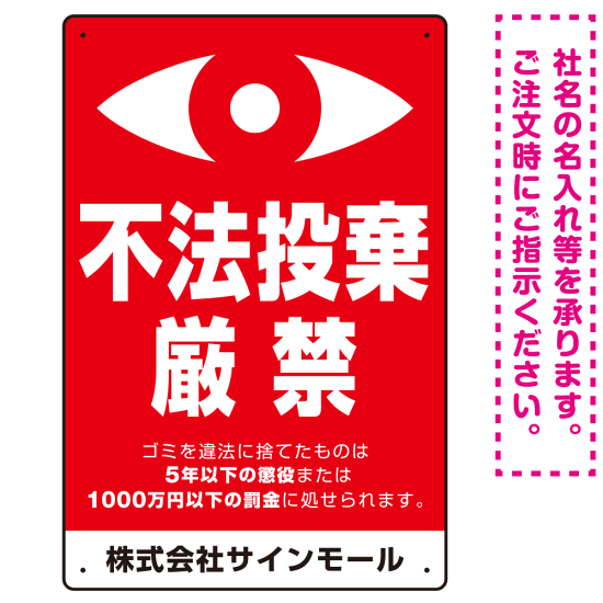 監視の目イラスト付き不法投棄厳禁 警告デザイン オリジナル プレート看板 タテ型 450×300 アルミ複合板