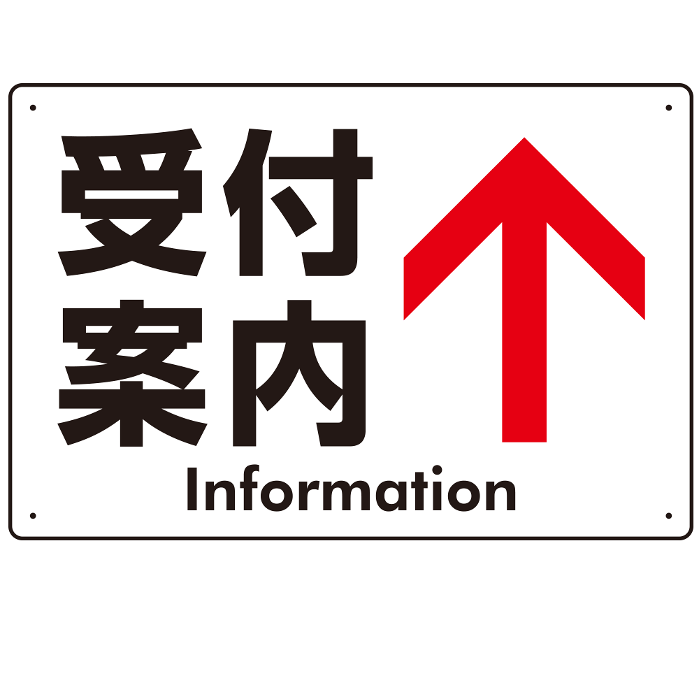 - 受付場所を案内する定番デザインのプレートサイン。白地に黒文字・赤矢印で視認性も抜群です。