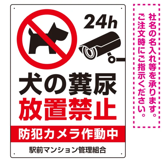 「ペットの糞尿禁止 防犯カメラ作動中 犬のシルエットデザイン プレート看板 タテ型 600×450 エコユニボード (SP-SMD553T-60x45U)」の導入をご検討中ですか? 大量注文・複数台のご検討に応じたお見積りのご相談、最短納期や送料、仕様・サイズの確認など、 注意・警告用プレート看板選びをまとめてサポートいたします。