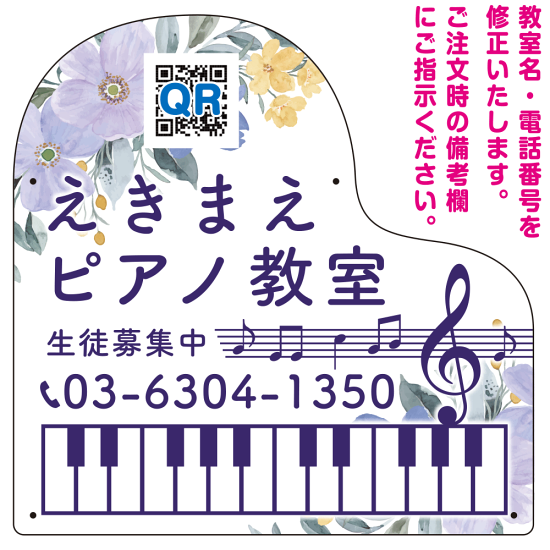 ピアノの形の変形プレート看板。鮮やかなフラワー背景が看板を引き立てます。カラーバリエーションも豊富にご用意。