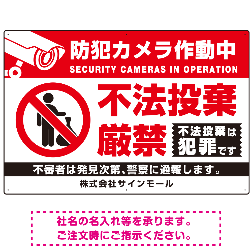 - 防犯カメラ作動中をしっかりアピールした上で、不法投棄を防止するプレート看板デザイン。