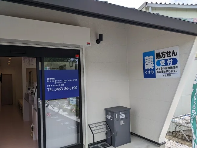 大きな「薬」の文字がよく目立つ処方せん受付用プレート看板。
