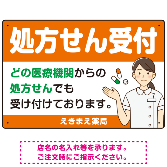 処方せん受付 白衣女性イラスト付きデザイン オリジナル プレート看板 オレンジ W450×H300 エコユニボード (SP-SMD564B-45x30U)