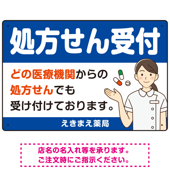 商品説明:処方せん受付 白衣女性イラスト付きデザイン オリジナル プレート看板 ブルー W450×H300 エコユニボード (SP-SMD564C-45x30U)