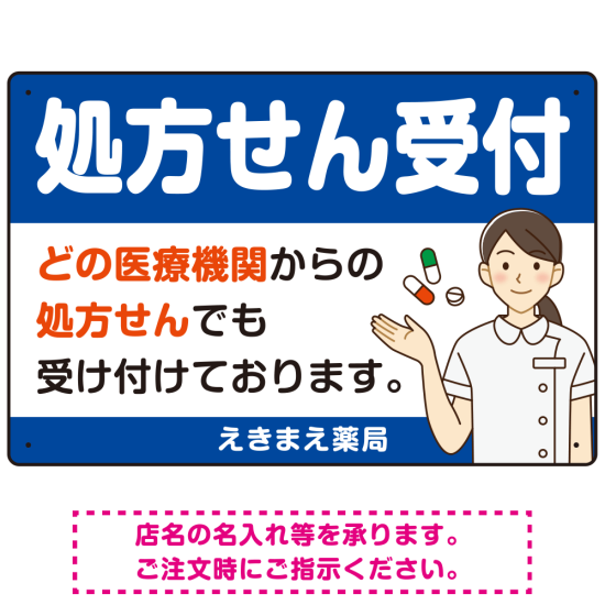 - 処方せん受付 白衣女性イラスト付きデザイン オリジナル プレート看板 ブルー W450×H300 エコユニボード (SP-SMD564C-45x30U)