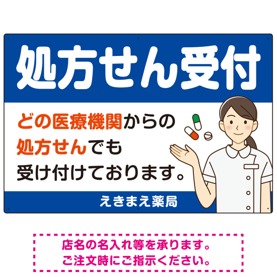 処方せん受付 白衣女性イラスト付きデザイン オリジナル プレート看板 ブルー W900×H600 アルミ複合板 (SP-SMD564C-90x60A)