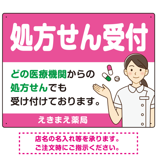 処方せん受付 白衣女性イラスト付きデザイン オリジナル プレート看板 ピンク W600×H450 アルミ複合板 (SP-SMD564D-60x45A)