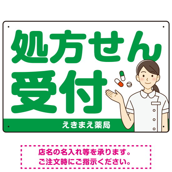 大きめ文字の処方せん受付 白衣女性イラスト付きデザイン オリジナル プレート看板 グリーン W450×H300 エコユニボード (SP-SMD567A-45x30U)