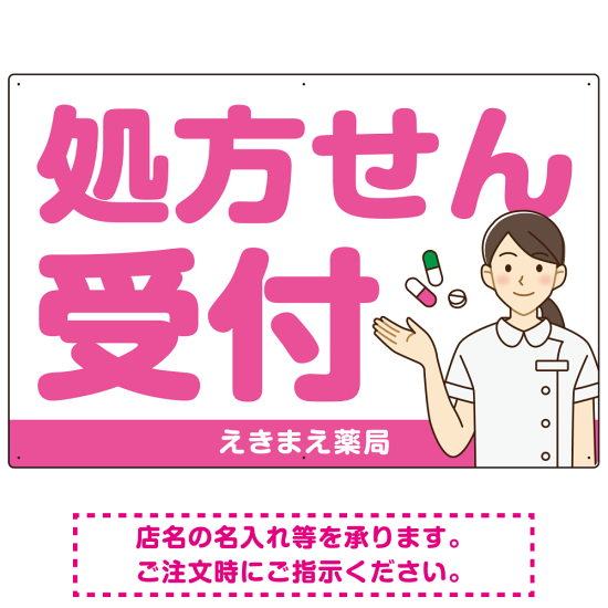大きめ文字の処方せん受付 白衣女性イラスト付きデザイン オリジナル プレート看板 ピンク W900×H600 エコユニボード (SP-SMD567D-90x60U)