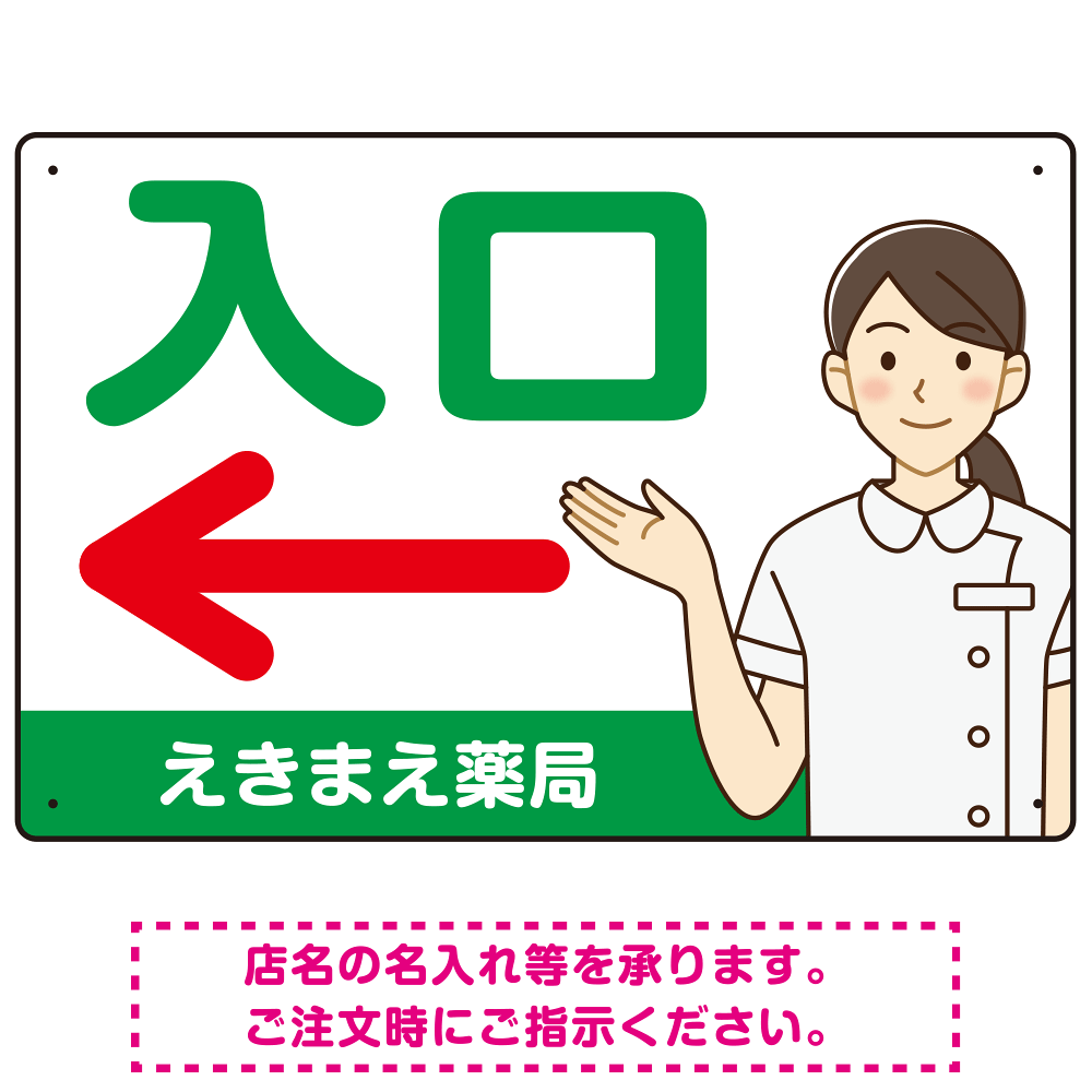 薬局向け入口案内サイン 白衣女性イラスト付きデザイン オリジナル プレート看板 グリーン(左矢印) W450×H300 エコユニボード (SP-SMD579AL-45x30U)