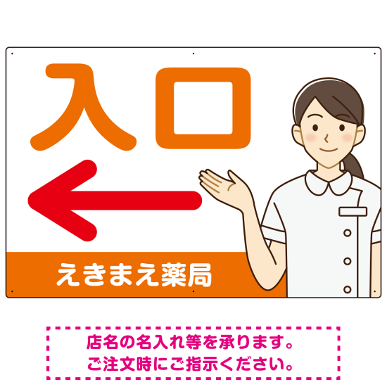 薬局向け入口案内サイン 白衣女性イラスト付きデザイン オリジナル プレート看板 オレンジ(左矢印) W900×H600 エコユニボード (SP-SMD579BL-90x60U)