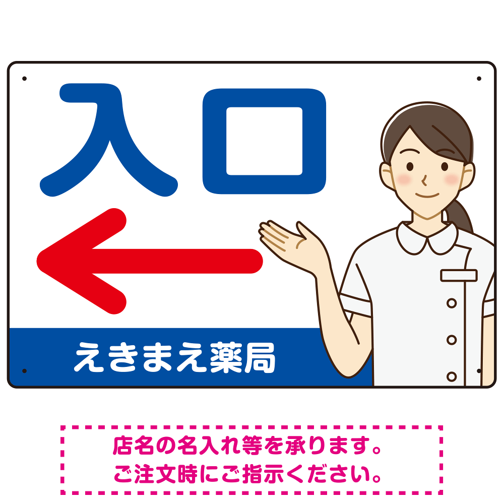 薬局向け入口案内サイン 白衣女性イラスト付きデザイン オリジナル プレート看板 ブルー(左矢印) W450×H300 エコユニボード (SP-SMD579CL-45x30U)