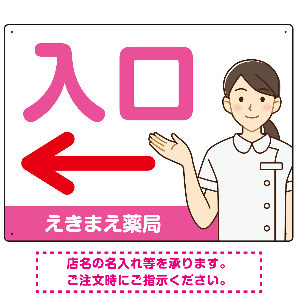 薬局向け入口案内サイン 白衣女性イラスト付きデザイン オリジナル プレート看板 ピンク(左矢印) W600×H450 エコユニボード (SP-SMD579DL-60x45U)