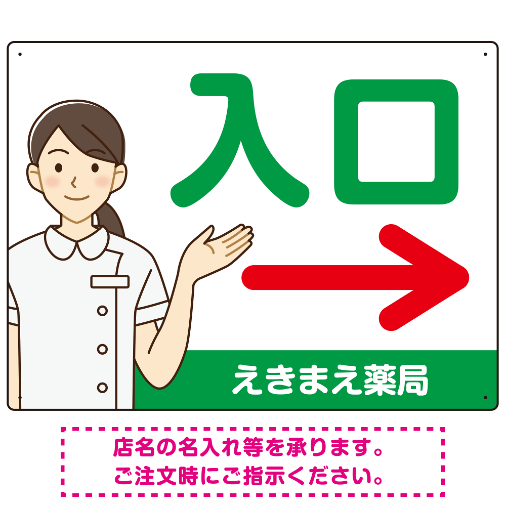 薬局向け入口案内サイン 白衣女性イラスト付きデザイン オリジナル プレート看板 グリーン(右矢印) W600×H450 エコユニボード (SP-SMD579AR-60x45U)