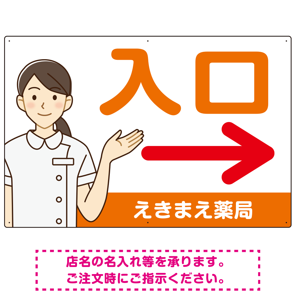 薬局向け入口案内サイン 白衣女性イラスト付きデザイン オリジナル プレート看板 オレンジ(右矢印) W900×H600 エコユニボード (SP-SMD579BR-90x60U)