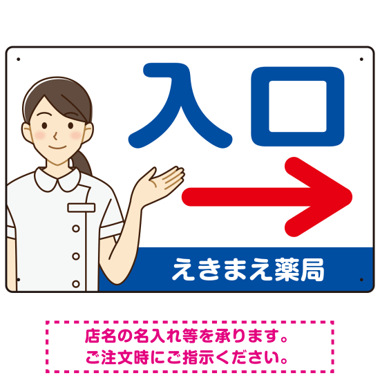- 白衣を着た女性のイラストがアイキャッチ効果を高める薬局向きの入口案内プレート看板。