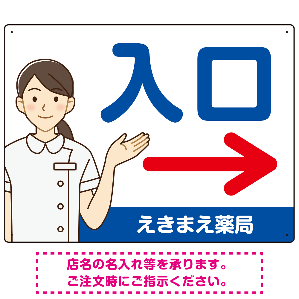 - 白衣を着た女性のイラストがアイキャッチ効果を高める薬局向きの入口案内プレート看板。