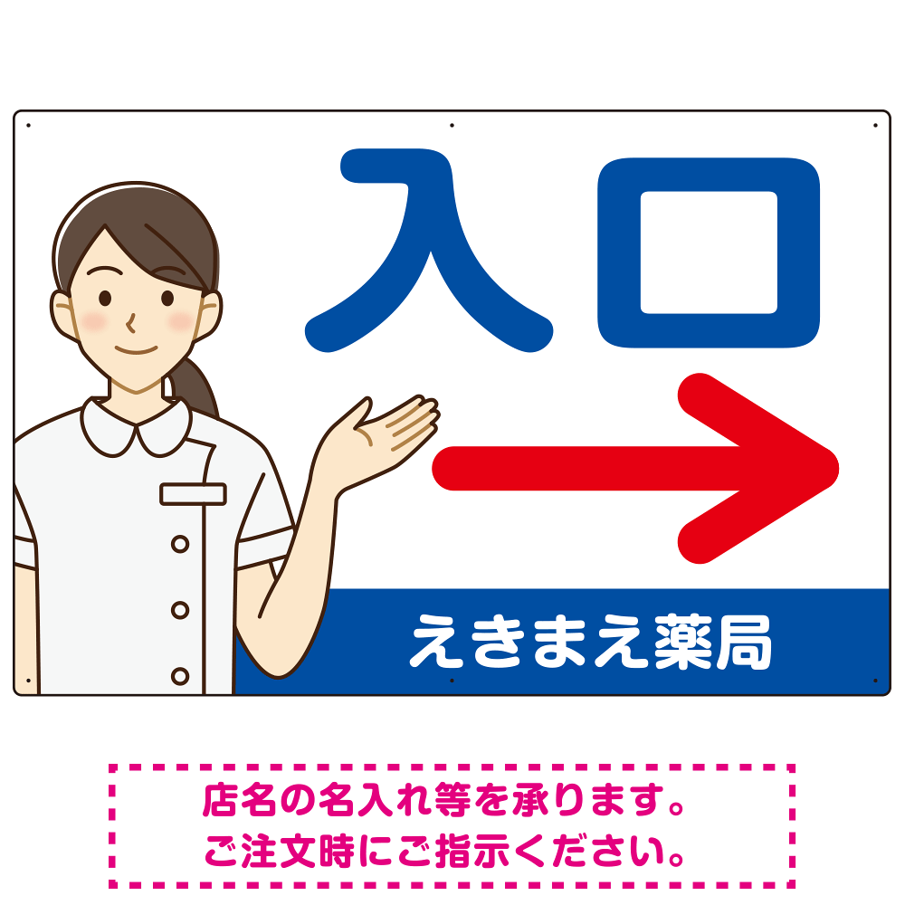 薬局向け入口案内サイン 白衣女性イラスト付きデザイン オリジナル プレート看板 ブルー(右矢印) W900×H600 エコユニボード (SP-SMD579CR-90x60U)