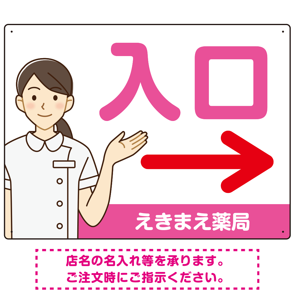 薬局向け入口案内サイン 白衣女性イラスト付きデザイン オリジナル プレート看板 ピンク(右矢印) W600×H450 エコユニボード (SP-SMD579DR-60x45U)