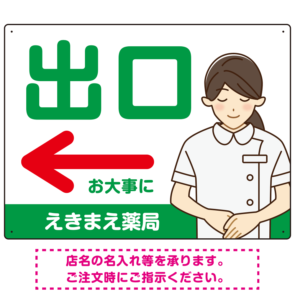 薬局向け出口案内サイン 白衣女性イラスト付きデザイン オリジナル プレート看板 グリーン(左矢印) W600×H450 エコユニボード (SP-SMD580AL-60x45U)