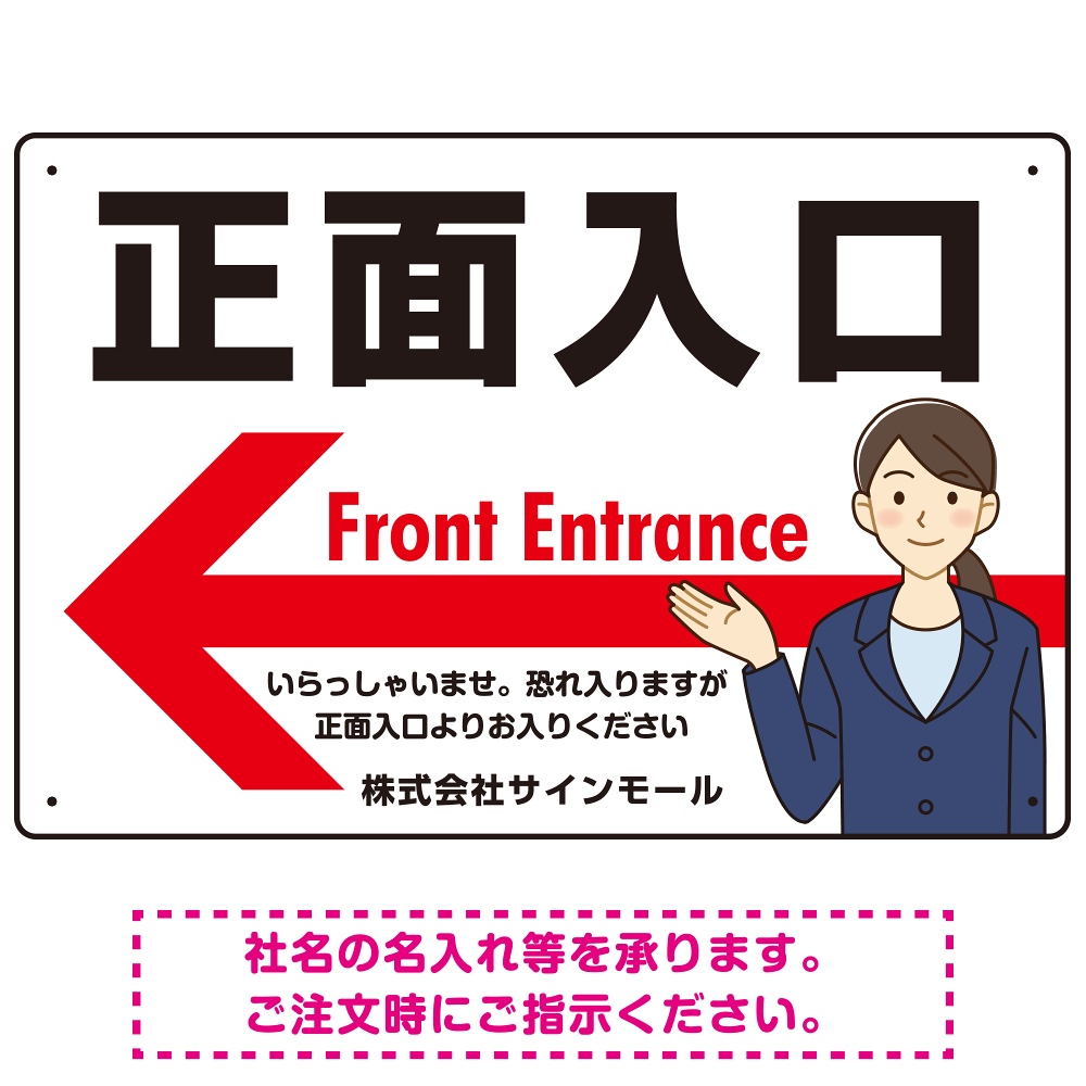 正面入口 スーツ女性イラストデザイン オリジナルプレート看板 左矢印 W450×H300 エコユニボード (SP-SMD583L-45x30U)